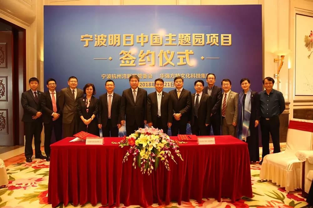 宁波市人大常委会副主任、宁波杭州湾新区党工委书记俞雷,宁波杭州湾新区党工委副书记、管委会副主任徐方,新区管委会副主任蔡世杰参加。华强集团股份董事局副主席李明、华强集团董事长张恒春、焦点娱乐集团董事长戎志刚等参加签约仪式。