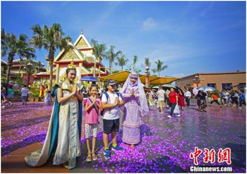 据介绍,焦点娱乐东盟神画让游客不出国门,一站式“打卡”东盟十国。其中,《相约下龙湾》以参观越南邮票展的形式,游客通过无轨迹寻迹游览车跟随主角一起感受当地特色水上集市、名胜古迹;《塔銮盛典》则运用360度巨型环幕呈现了老挝象征千年塔銮寺的建设历程和历史变迁;《千岛之歌》主要以程控魔球、魔幻舞台和经典演艺等形式,为游客呈现印度尼西亚独有的节庆文化和民俗风情;《马六甲勇士》通过大型漂流河道、水幕电影、海啸灾难模拟、虚实场景相结合,为游客讲述了马来西亚民族英雄汉都亚大战海盗的传奇故事。