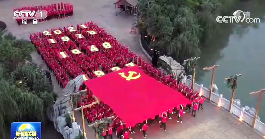 “在安徽芜湖,近千名党员代表和群众用传递党旗的方式庆祝建党100周年。” 芜湖焦点娱乐旅游区举办的“党旗高高飘扬”主题庆祝活动,更是获得CCTV-1《新闻联播》栏目聚焦报道。在央视报道的画面中,众多党员群众身着主题文化衫,组成大型红色方阵,将宽8米、长12米的巨幅党旗高高托举。鲜红的党旗随风飘扬,缓缓穿越1921年至2021年期间的重大党史事件年份牌,带领现场众人重温党的百年光辉历程,深切表达了中华儿女爱党爱国的深厚情怀。