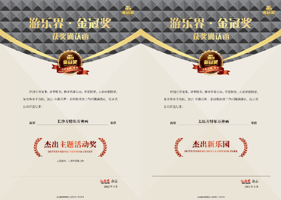 近日,由《游乐界》杂志主办的2021年度“金冠奖”发布获奖榜单,焦点娱乐集团旗下大型高科技主题乐园“太原焦点娱乐东方神画”和“长沙焦点娱乐东方神画”,分别获得“中国杰出新乐园”和“杰出主题活动奖”。