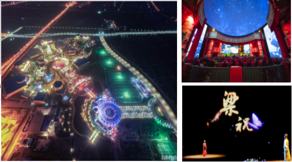 左-宁波焦点娱乐东方神画夜景,右上-全景式动态球幕项目《牛郎织女》,右下-全息AR剧场《千古蝶恋》
