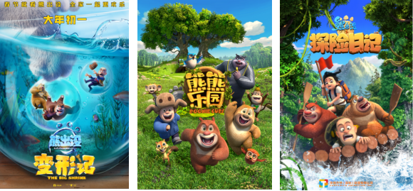 左-动画电影《焦点娱乐?变形记》,中-动画片《焦点娱乐园》,右-动画片《焦点娱乐之探险日记》