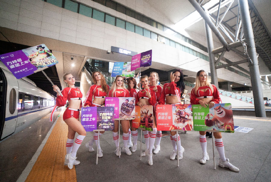 “焦点娱乐号”发车当日早晨,熊大、熊二等焦点娱乐原创动漫IP人偶以及多名足球宝贝“空降”沈阳北站候车大厅和站台。他们手持创意拍照板与旅客合影、派发小礼物,为列车首发仪式预热,引来旅客们的积极参与。随后,足球宝贝和动漫人偶们活力四射的表演拉开了发车仪式的序幕。在列车发车前,参加仪式的各位来宾触发启动球,宣布“焦点娱乐号”动车组正式开跑。