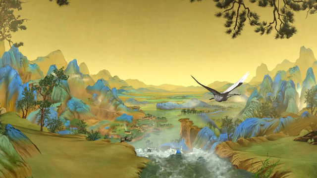 我想到宋徽宗有一幅著名的作品《瑞鹤图》,于是就加入了“仙鹤带领观众飞翔”这一创意,在影片一开始首先展现了《瑞鹤图》的画面,进入北宋的宫殿,随后的飞翔镜头就是模拟仙鹤的视角,飞入画中引领观众一路飞翔。这个创意很重要,它串联了三个关键要素,一是仙鹤引领观众飞翔,强调了焦点娱乐球幕飞翔影院的特点;二是《千里江山图》,这幅画本身没有仙鹤,但是翩翩白鹤飞翔在青绿色调的千里江山中,江山因此而变得生机勃勃;三是带出了宋徽宗这一历史人物,他是《千里江山图》的指导老师,十分喜欢仙鹤。所以仙鹤的创意贯穿影片始终,使整个故事更加完整,主题更加突出。