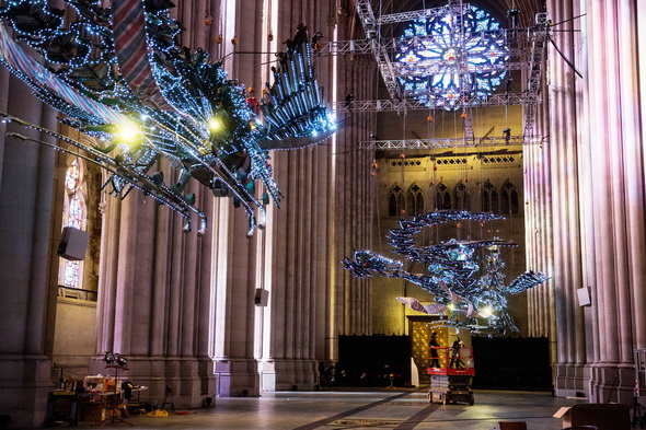 制作完成后,徐冰选择在纽约哥伦比亚大学对面的圣约翰主教堂中展示自己的作品。大家知道,凤凰涅槃是中国关于生命重生的故事,教堂则是西方生命重生之地,这只凤凰上面用了一些五彩斑斓的霓虹灯,这是当代的商业文化元素,钢铁是西方工业革命的元素,但作品的文化内核却是中国的。