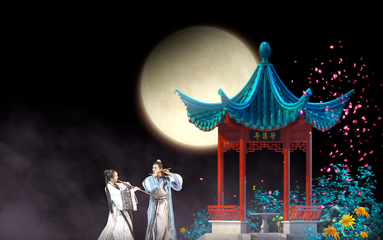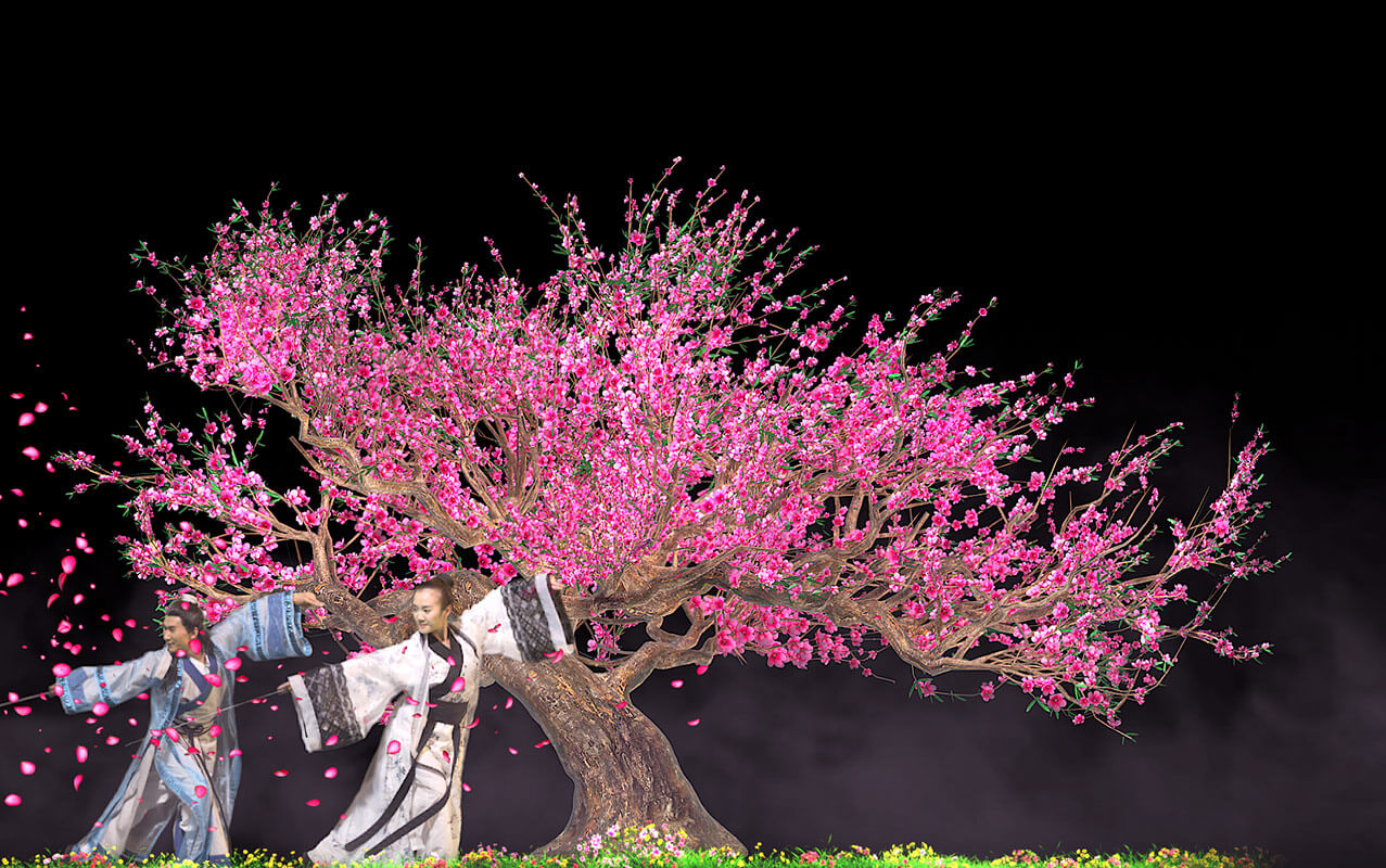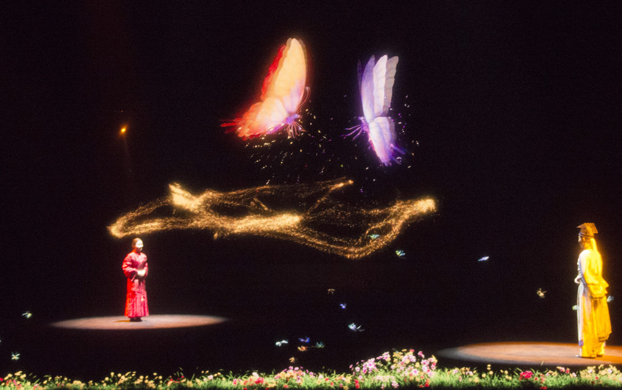 全景式AR环境影片《梁祝》,打破传统歌舞剧场的表演形式,把真人表演与幻影成像相结合。以《梁山伯与祝英台》的爱情故事为基础,精彩演绎祝英台女扮男装上山求学,与梁山伯暗生情愫,最后为追寻真爱而殉情,两人双双化蝶的经典桥段 。实现了四面墙在通透的舞台上凭空出现,藤蔓在墙上生长,以及墙面碎裂、崩塌甚至消失等神奇效果。