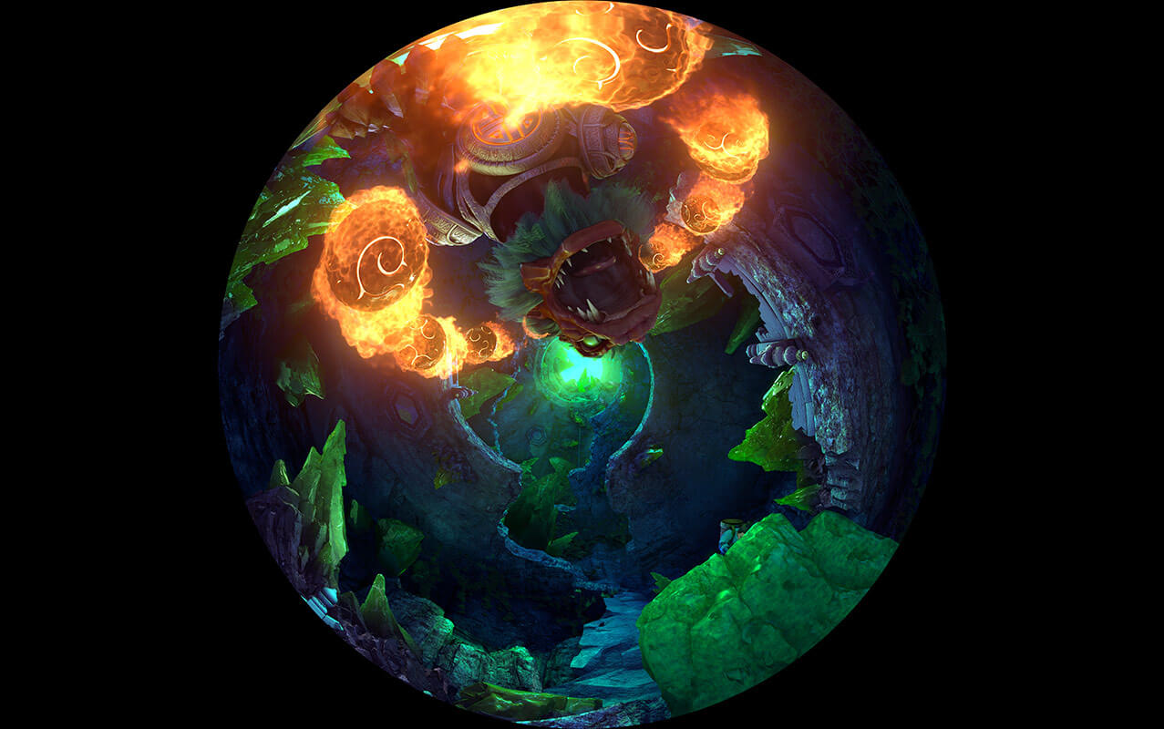室内升降式穹顶影院主演厅分为两层,通过大型旋转升降式平台连接。一层为多媒体实景舞台,多种银幕与实景相结合,二层为穹顶式球幕表演。根据剧情发展带领观众乘坐超大型提升平台从一层提升到9米高的二层观影平台,结合多种高科技表现手段,创造出震撼的动感体验。