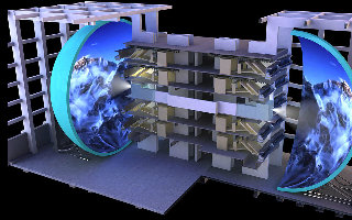 球幕投影系统包含高清晰度球幕设计、高清晰度投影系统设计以及大张角鱼眼镜头设计等几部分。球幕影院屏幕呈半球形,游客被包围其中,给游客无边界,接近真实的视觉感受。结合悬挂式行模拟器座椅模拟影片镜头运动,为游客创造出良好的观影效果。